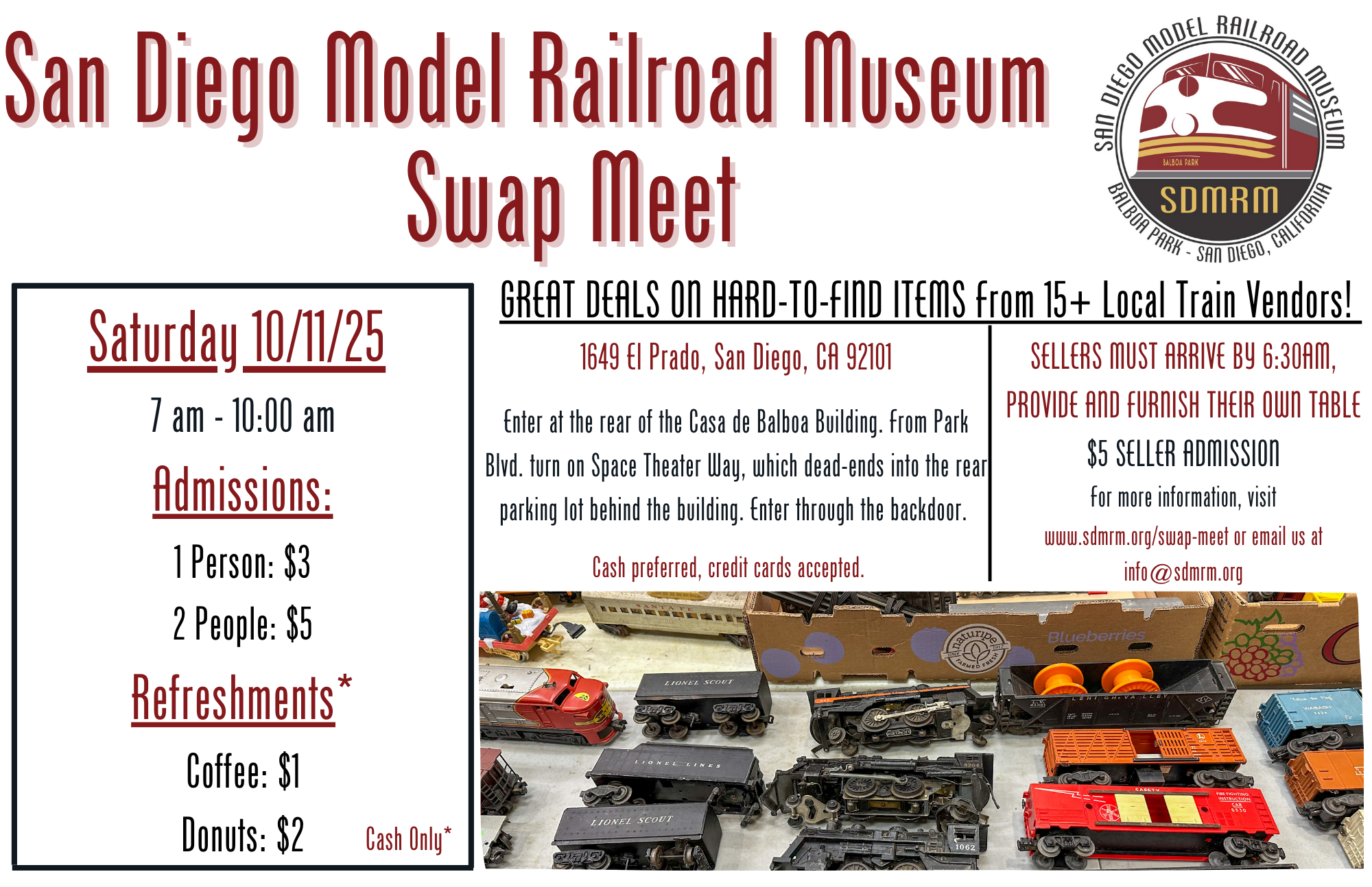 Sellers must reserve their slot by emailing info@sdmrm.org by end of day Thursday before the swap meet.